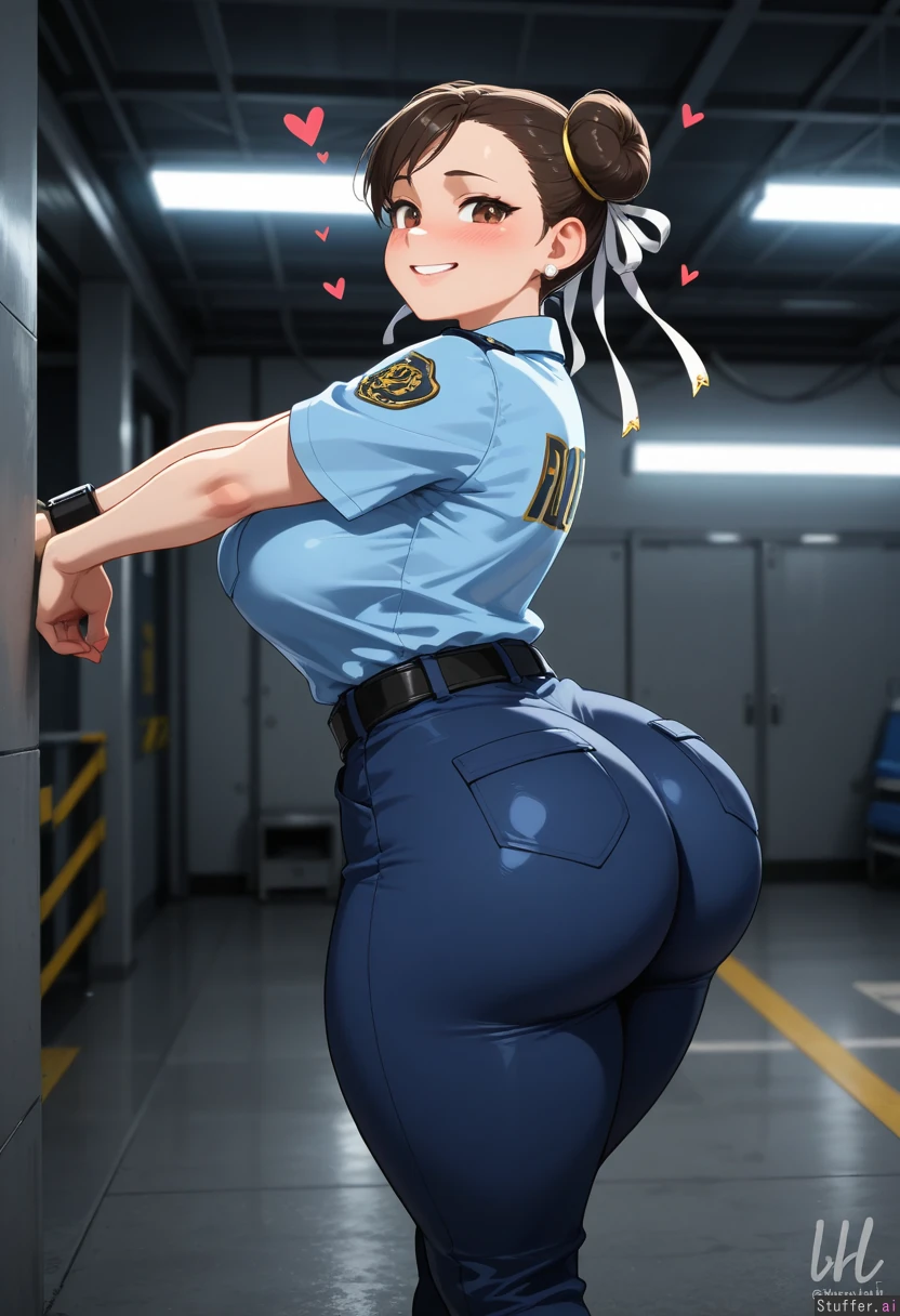 ((Highest quality, high resolution, hdr, uhd, 8k, incredible shading and lighting, high detail)) Location: 1 female, (solo), (Chun-li), (wearing police uniform, light blue police shirt, dark blue pants, black belt, no hat), (morbidly obese:.0), (gigantic fat belly:.0), (happy, blushing, hearts), wide_ass , mega legs, Stretch the fabric of the pants
