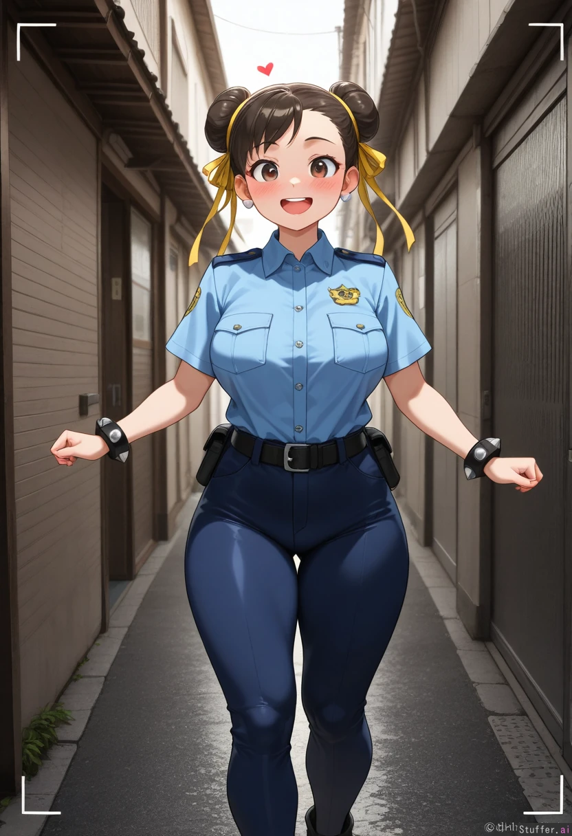 ((Highest quality, high resolution, hdr, uhd, 8k, incredible shading and lighting, high detail)) Location: 1 female, (solo), (Chun-li), (wearing police uniform, light blue police shirt, dark blue pants, black belt, no hat), (morbidly obese:.0), (gigantic fat belly:.0), (happy, blushing, hearts), Stretch the t shirt