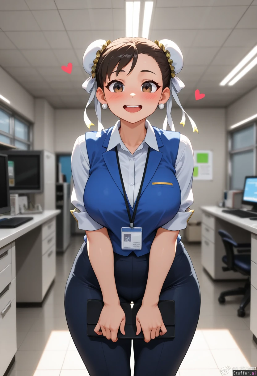 ((Highest quality, high resolution, hdr, uhd, 8k, incredible shading and lighting, high detail)) Location: 1 female, (solo), (Chun-li), (wearing office clothes), (morbidly obese:.0), (gigantic fat belly:.0), (happy, blushing, hearts),