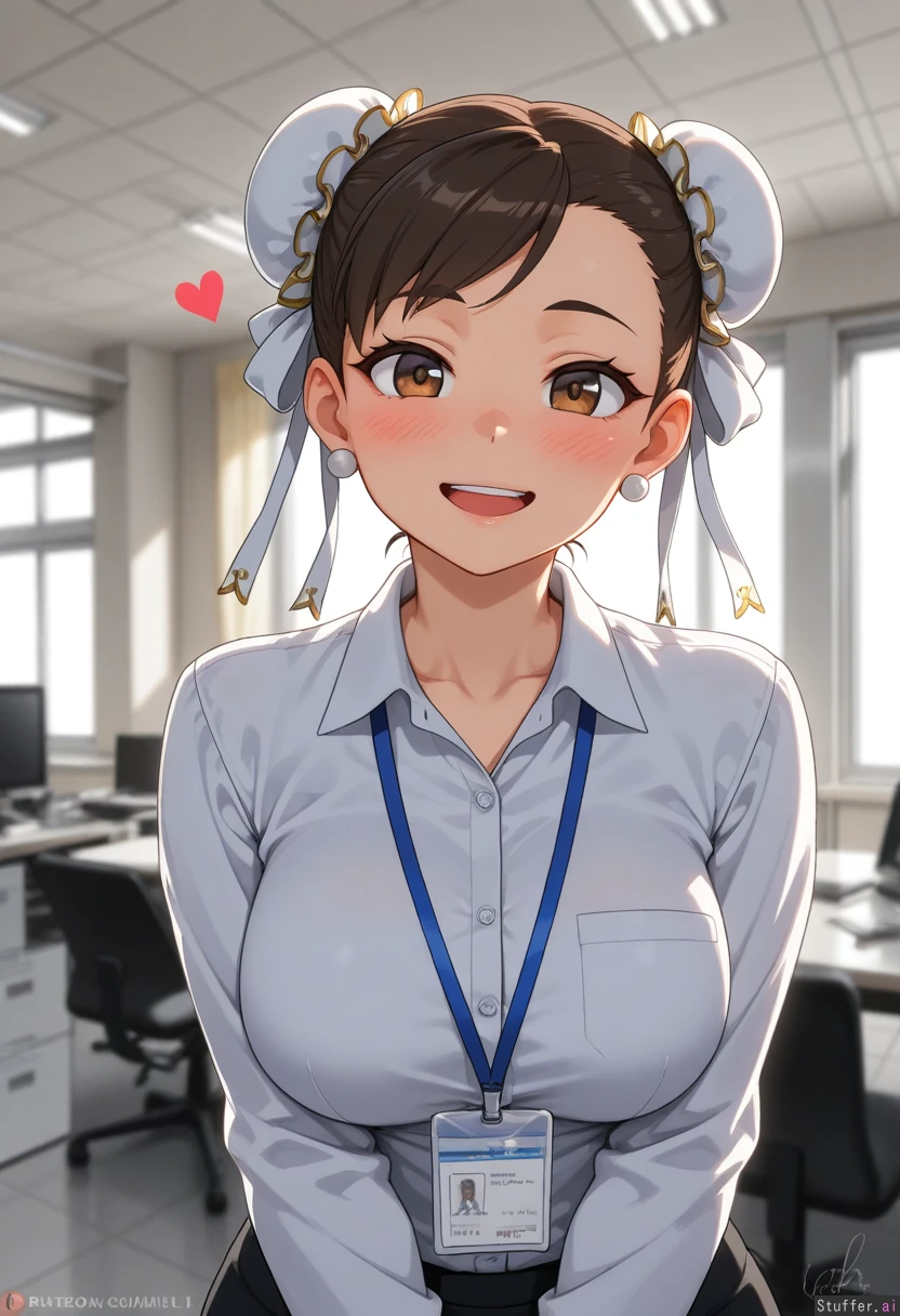 ((Highest quality, high resolution, hdr, uhd, 8k, incredible shading and lighting, high detail)) Location: 1 female, (solo), (Chun-li), (wearing office clothes, no hat), (morbidly obese:.0), (gigantic fat belly:.0), (happy, blushing, hearts),