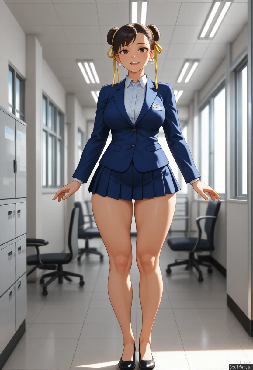 ((Highest quality, high resolution, hdr, uhd, 8k, incredible shading and lighting, high detail)) Location: 1 female, (solo), (Chun-li), (wearing office clothes, Mini skirt, no hat), (morbidly obese:.0), (gigantic fat belly:.0), (happy, hearts),