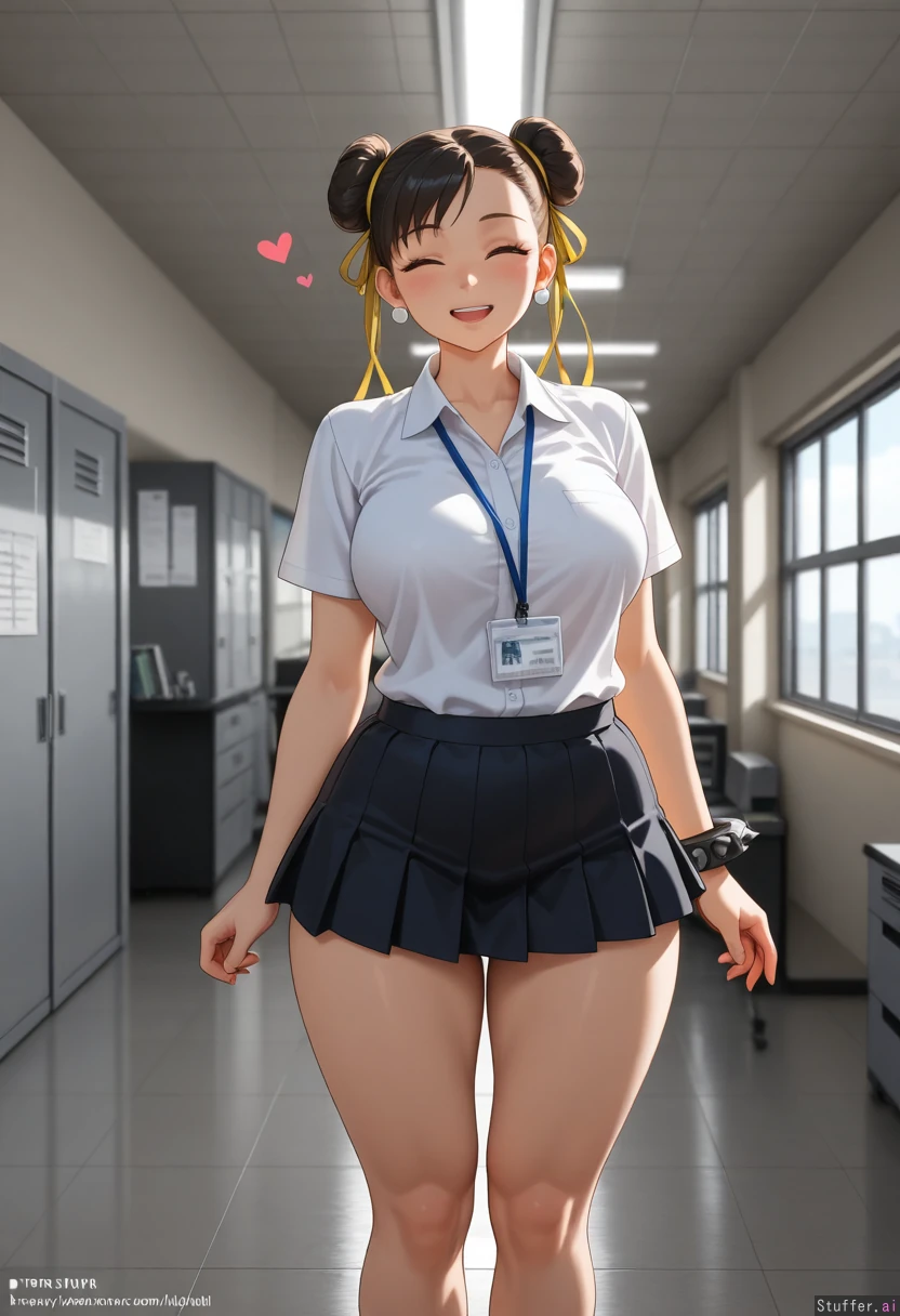 ((Highest quality, high resolution, hdr, uhd, 8k, incredible shading and lighting, high detail)) Location: 1 female, (solo), (Chun-li), (wearing office clothes, Mini skirt, no hat), (morbidly obese:.0), (gigantic fat belly:.0), (happy, hearts),