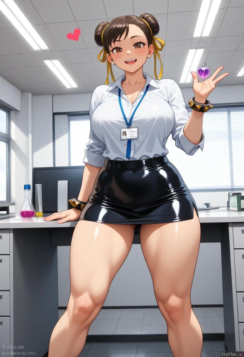 ((Highest quality, high resolution, hdr, uhd, 8k, incredible shading and lighting, high detail)) Location: desk 1 female, (solo), (Chun-li), (wearing office clothes, Mini skirt Leather, no hat), (morbidly obese:.0), (gigantic fat belly:.0), (happy, hearts), potion blue, drink potion