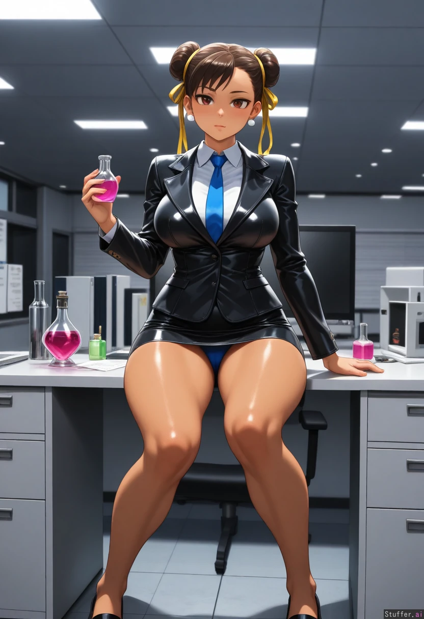 ((Highest quality, high resolution, hdr, uhd, 8k, incredible shading and lighting, high detail)) Location: desk 1 female, (solo), (Chun-li), (wearing office clothes, Mini skirt Leather, no hat), (morbidly obese:.0), (gigantic fat belly:.0), (, hearts), potion blue, drink potion, Drinking potion