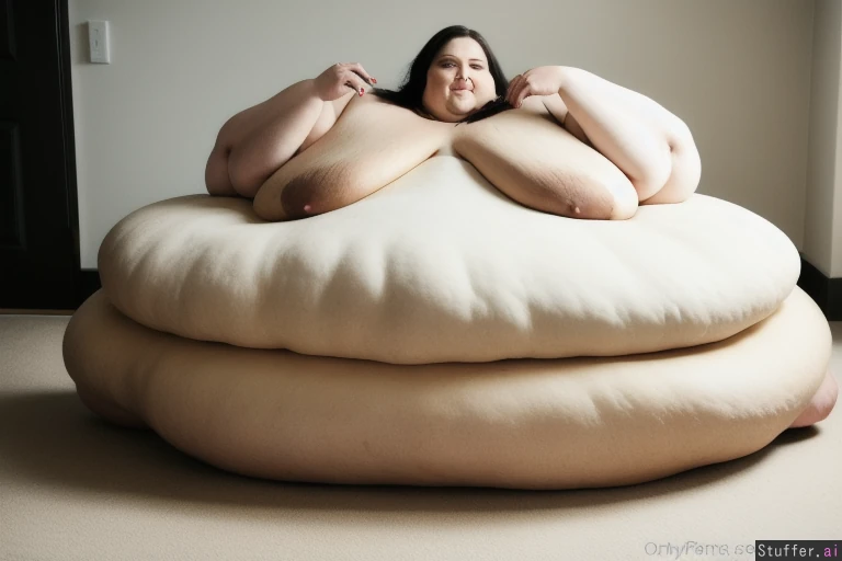 -full body view of a beautiful naked woman -sitting immobile on floor -super obese bakery fed soft squishy blob -thick heavy blob belly squashing legs