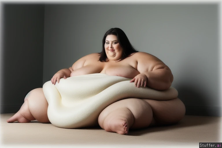 -full body view of a beautiful naked woman -sitting immobile on floor -super obese bakery fed soft squishy blob -thick heavy blob belly squashing legs