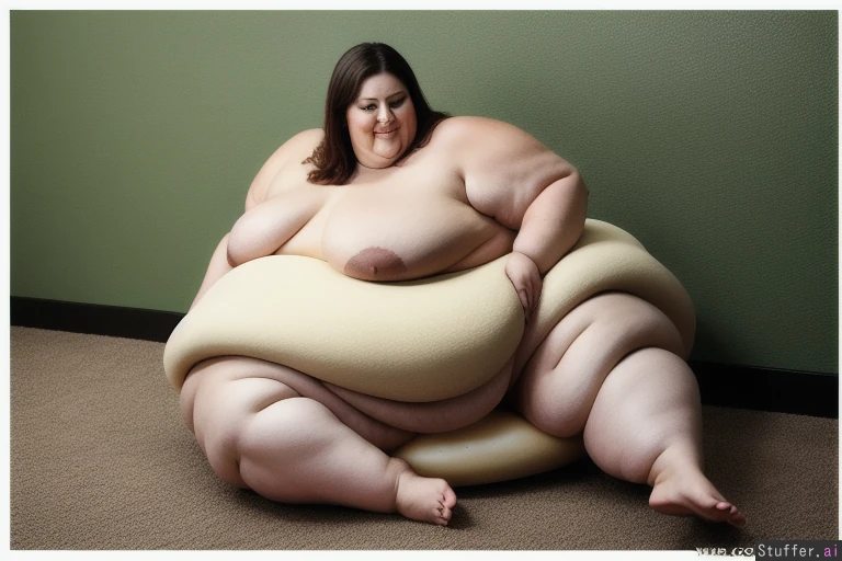 -full body view of a beautiful naked woman -sitting immobile on floor -super obese bakery fed soft squishy blob -thick heavy blob belly squashing legs into a split position -real skin and fat woman