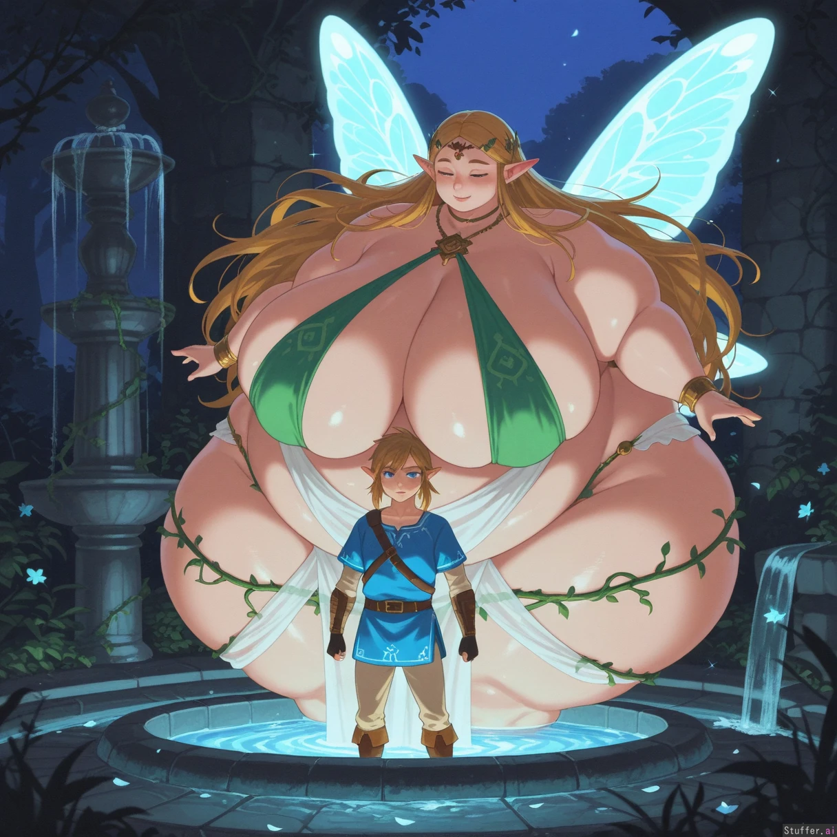 uhd, high resolution, flawless, best_quality, (inkerton-kun\(artist\):1.2), link, zelda, the legend of zelda, breath of the wild, botw, couple, romantic, love, close, looking at each other, smile, intimate, leaning in, great fairy zelda, fairy wings, translucent wings, glowing wings, magical aura, sparkles, (midair zelda, floating zelda,:0.9) ethereal, short hair, flowing hair, flower petals, vines, enchanted, fountain_garden, garden, water, stone_fountain, flowers, lush_vegetation, greenery, petals, outdoors, scenic_background, (morbidly_obese_girl:1.0), (Fat Arms:1.2), (gigantic_fat_thighs), (tall female), (gigantic sagging breasts:1.2), (enormous wide hips), (size diffrence:1.2), (revealing_clothes:1.0),