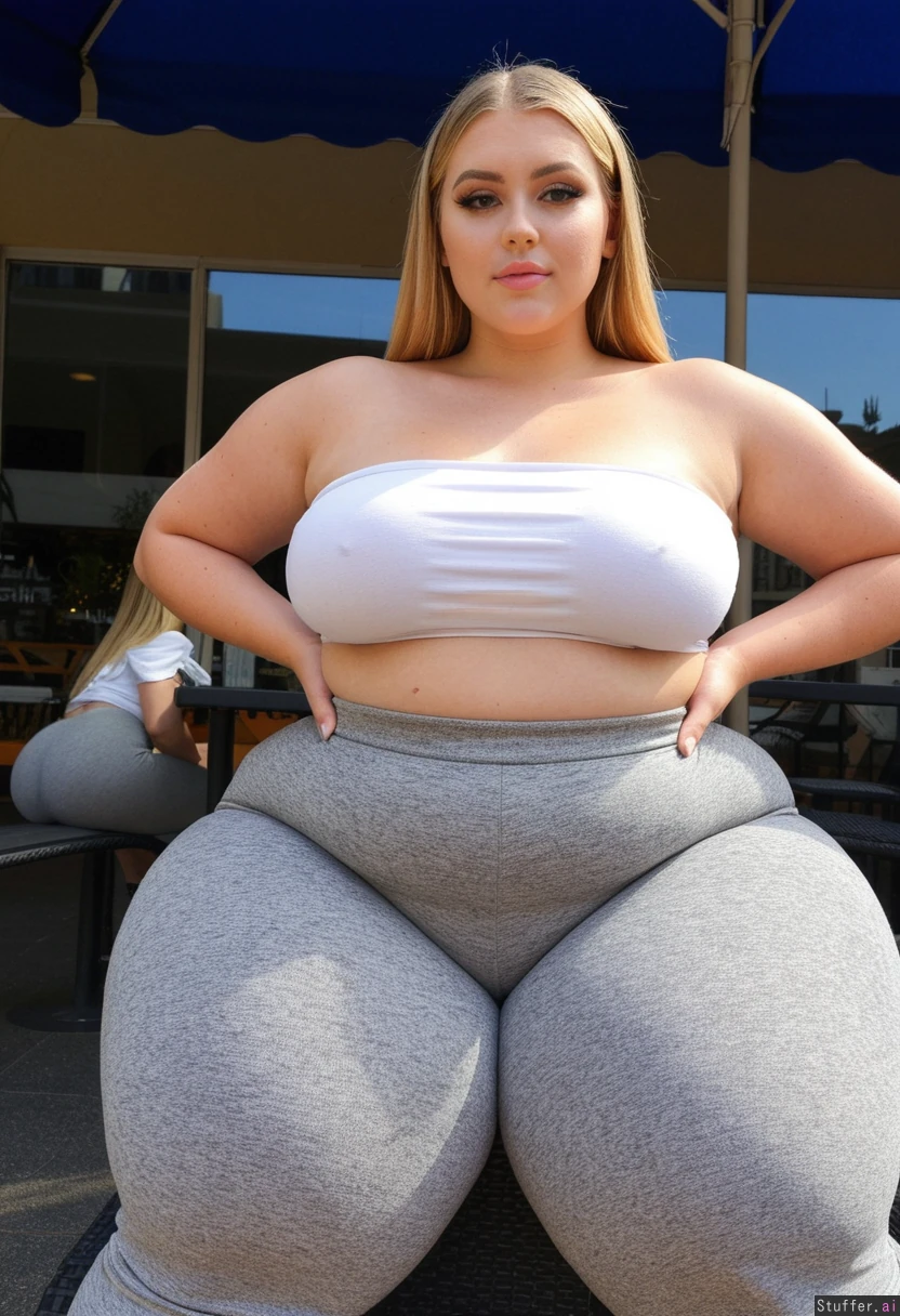 (Perfect anatomy, cute model perfect face:1.6, blonde, alt girl, e girl, 20 year old european , slim face, eyeliner, eyelashes, e girl makeup, perfect skin, green eyes,) (Grey gigantic smooth flare_pants,, white strapless tube_top) (Huge overflowing cleavage:1.1) ((Huge wide hips and big thick round soft thighs:1.2 )) ((Tightly packed thick and dense hips and gluteal_mass:1.2) (Slim waist:1.0) sunny, sittin in outdoor cafe, legs_together, hands resting on hips, full body visible,body side view