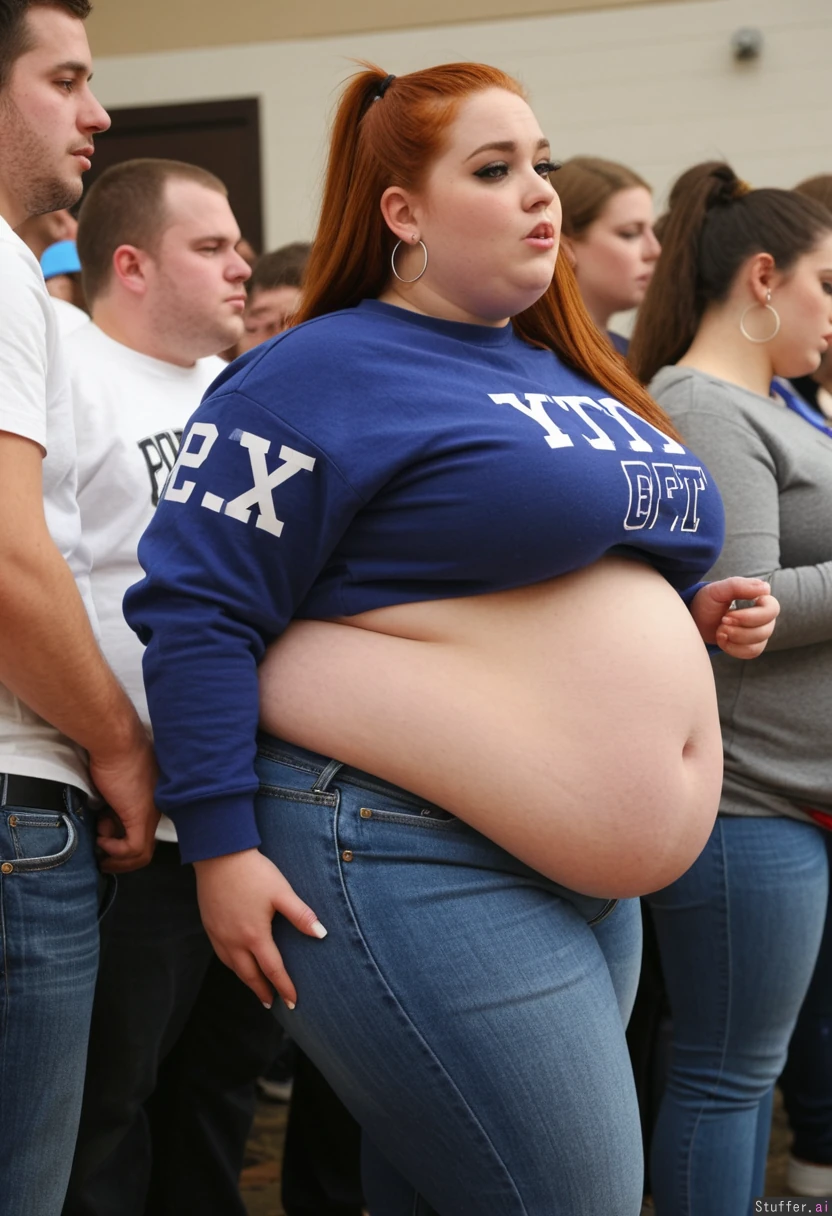 Fully clothed fashion close-up photo, trendy super obese outfit, uktra overweight college student, 21-years-old, wearing ultra bloated and extremely fat-bellied adipose long covering college sweatshirt dress, and fat bloated oversized denim leggings, ultra fat overhanging ballooned-up belly beneath clothing, she is standing at an crowded eating contest in a crowded college festival, ultra attractive symmetrical face of a top model, elegant lonh hair, trendy makeup, earrings, foxy look with eyeliner, fat arms, largest hyper_belly ever seen beneath her clothing, festival vibes, side view, no nudity, afternoon,