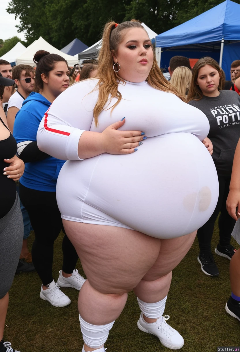 Fully clothed Fashion photo, Instagram lookbook, trendy outfit, obese college student, 21-years-old, wearing ultra bloated and extremely fat-bellied covering trendy adipose track suit, ultra fat overhanging ballooned-up belly beneath clothing, she is standing at an crowded eating contest in a crowded college festival, ultra attractive symmetrical face of a top model, trendy makeup, fancy earrings, foxy look with eyeliner, long elegant hair, fat arms, largest hyper_belly ever seen beneath her clothing, festival vibes, side view, absolutely no nudity, afternoon,