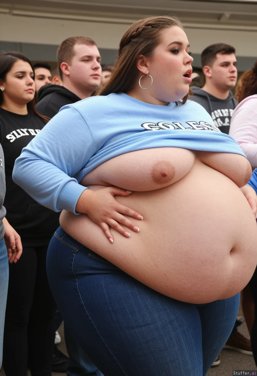 Fully clothed fashion close-up photo, trendy super obese outfit, uktra overweight college student, 21-years-old, wearing ultra bloated and extremely fat-bellied adipose long covering college sweatshirt dress, and fat bloated oversized denim leggings, ultra fat overhanging ballooned-up belly beneath clothing, she is standing at an crowded eating contest in a crowded college festival, ultra attractive symmetrical face of a top model, elegant lonh hair, trendy makeup, earrings, foxy look with eyeliner, fat arms, largest hyper_belly ever seen beneath her clothing, festival vibes, side view, no nudity, afternoon,