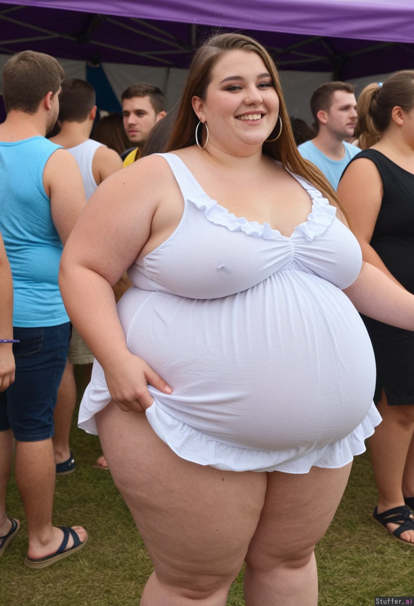 Fully clothed Fashion photo, trendy outfit, obese college student, 21-years-old, wearing ultra bloated and extremely fat-bellied adipose covering sleeveless summerdress with frilled details, ultra fat overhanging ballooned-up hyper_belly beneath clothing, she is standing at an crowded eating contest in a crowded college festival, ultra attractive symmetrical face of a top model, trendy makeup, earrings, beautiful smile with eyeliner, long straight elegant hair, fat arms, largest hyper_belly ever seen beneath her clothing, festival vibes, side view, no nudity, afternoon,