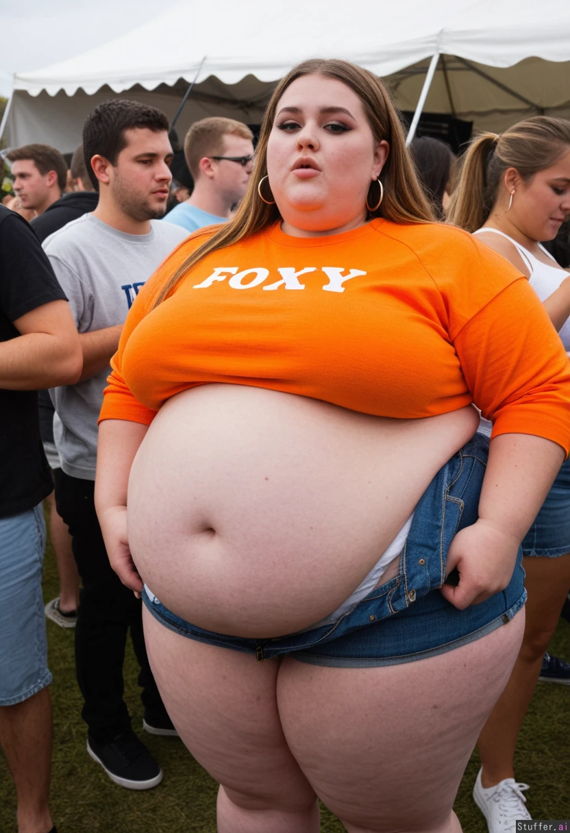 Trendy Fashion photo, obese college student, fully clothed, 21-years-old, wearing a covering ultra bloated and extremely fat-bellied college sweatshirt dress, and fat denim skirt, ultra fat overhanging ballooned-up belly beneath clothing, she is standing at an crowded eating contest in a crowded college festival, ultra attractive symmetrical face of a top model, makeup, earrings, foxy look with eyeliner, fat arms, largest hyper_belly ever seen beneath her clothing, festival vibes, side view, no nudity, afternoon,