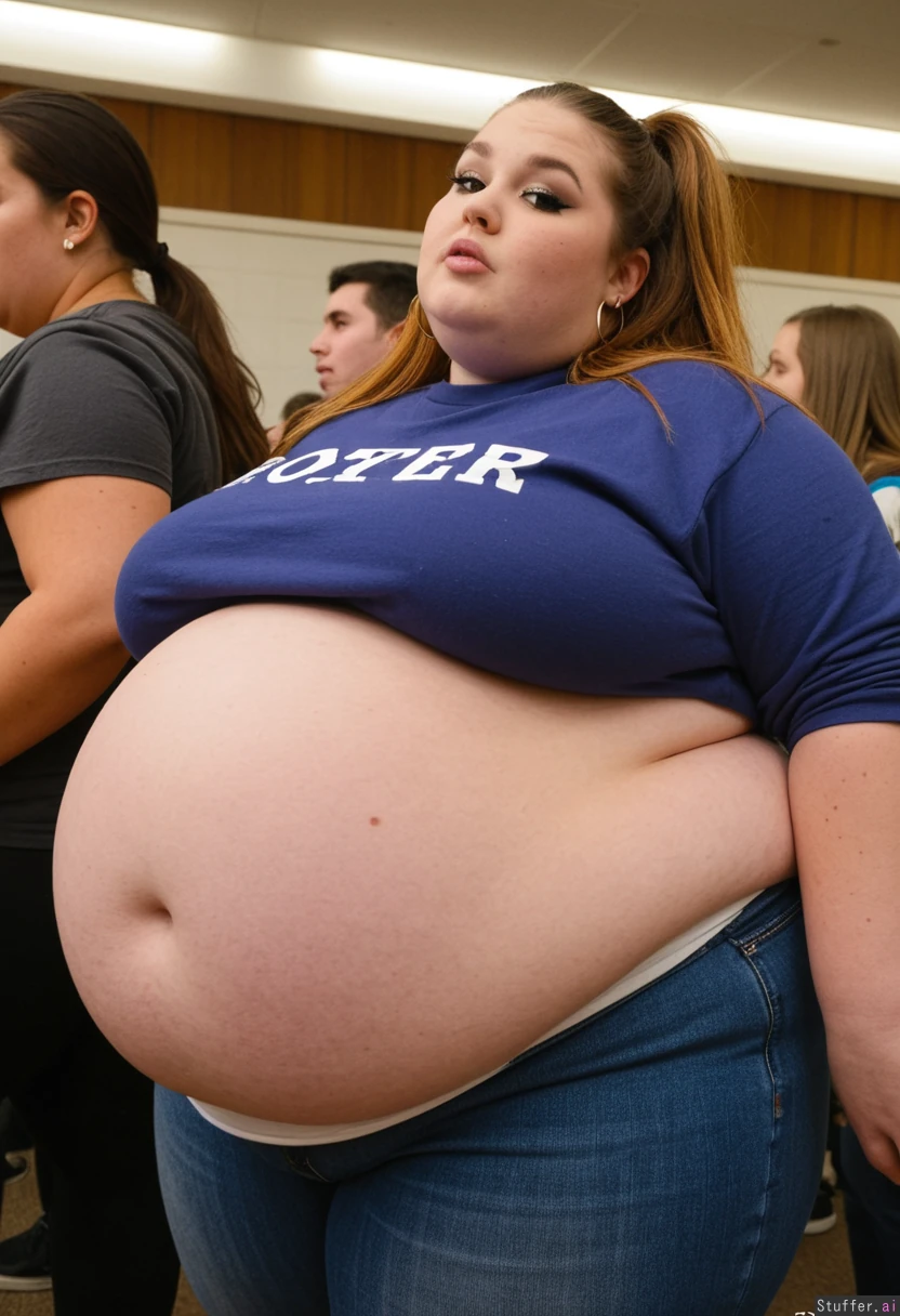 Fully clothed fashion close-up photo, trendy super obese outfit, uktra overweight college student, 21-years-old, wearing a covering ultra bloated and extremely fat-bellied adipose college sweatshirt dress, and fat bloated oversized denim leggings, ultra fat overhanging ballooned-up belly beneath clothing, she is standing at an crowded eating contest in a crowded college festival, ultra attractive symmetrical face of a top model, elegant lonh hair, trendy makeup, earrings, foxy look with eyeliner, fat arms, largest hyper_belly ever seen beneath her clothing, festival vibes, side view, no nudity, afternoon,