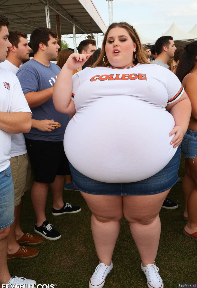 Trendy Fashion photo, obese college student, fully clothed, 21-years-old, wearing a covering ultra bloated and extremely fat-bellied college sweatshirt dress, and fat denim skirt, ultra fat overhanging ballooned-up belly beneath clothing, she is standing at an crowded eating contest in a crowded college festival, ultra attractive symmetrical face of a top model, makeup, earrings, foxy look with eyeliner, fat arms, largest hyper_belly ever seen beneath her clothing, festival vibes, side view, no nudity, afternoon,