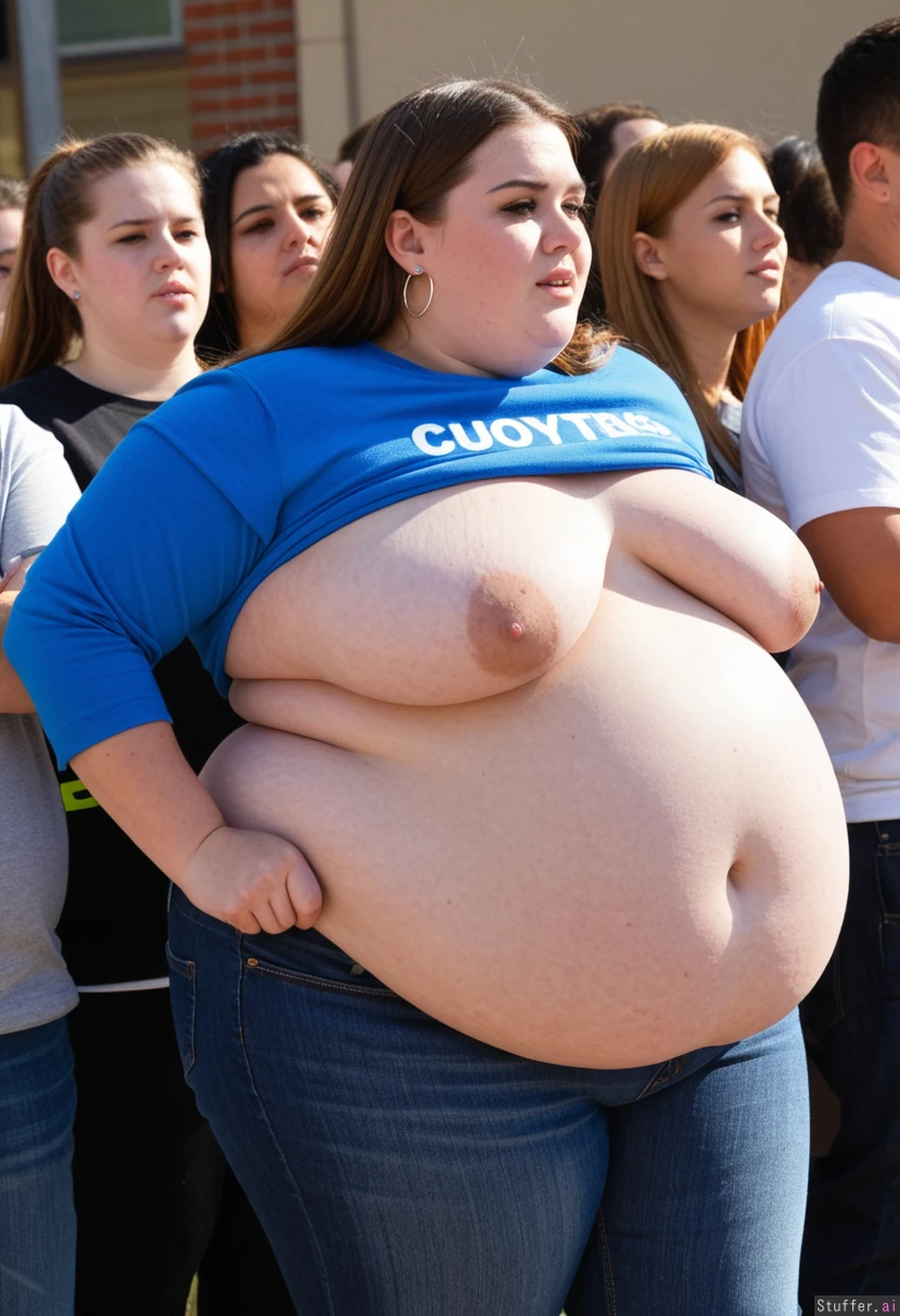 Fully clothed fashion close-up photo, trendy super obese outfit, uktra overweight college student, 21-years-old, wearing a covering ultra bloated and extremely fat-bellied adipose college sweatshirt dress, and fat bloated oversized denim leggings, ultra fat overhanging ballooned-up belly beneath clothing, she is standing at an crowded eating contest in a crowded college festival, ultra attractive symmetrical face of a top model, elegant lonh hair, trendy makeup, earrings, foxy look with eyeliner, fat arms, largest hyper_belly ever seen beneath her clothing, festival vibes, side view, no nudity, afternoon,