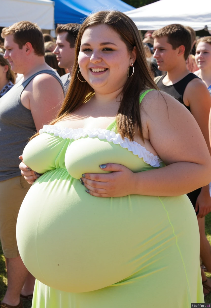 Fully clothed Fashion photo, trendy outfit, obese college student, 21-years-old, wearing ultra bloated and extremely fat-bellied adipose covering sleeveless summerdress with frilled details, ultra fat overhanging ballooned-up hyper_belly beneath clothing, she is standing at an crowded eating contest in a crowded college festival, ultra attractive symmetrical face of a top model, trendy makeup, earrings, beautiful smile with eyeliner, long straight elegant hair, fat arms, largest hyper_belly ever seen beneath her clothing, festival vibes, side view, no nudity, afternoon,