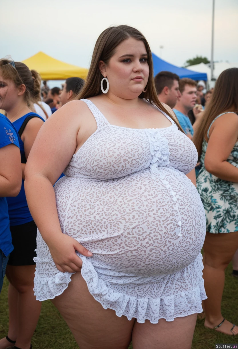 Fully clothed Fashion photo, trendy outfit, obese college student, 21-years-old, wearing ultra bloated and extremely fat-bellied adipose covering sleeveless summerdress with frilled details, ultra fat overhanging ballooned-up hyper_belly beneath clothing, she is standing at an crowded eating contest in a crowded college festival, ultra attractive symmetrical face of a top model, trendy makeup, earrings, critical look with eyeliner, long straight elegant hair, fat arms, largest hyper_belly ever seen beneath her clothing, festival vibes, side view, no nudity, afternoon,