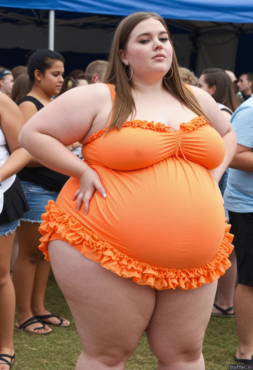 Fully clothed Fashion photo, trendy outfit, obese college student, 21-years-old, wearing ultra bloated and extremely fat-bellied adipose covering sleeveless summerdress with frilled details, ultra fat overhanging ballooned-up hyper_belly beneath clothing, she is standing at an crowded eating contest in a crowded college festival, ultra attractive symmetrical face of a top model, trendy makeup, earrings, critical look with eyeliner, long straight elegant hair, fat arms, largest hyper_belly ever seen beneath her clothing, festival vibes, side view, no nudity, afternoon,