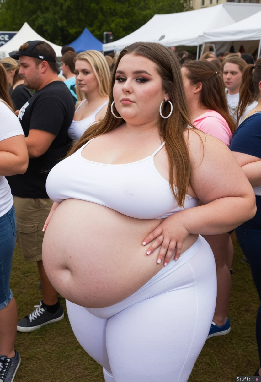Fully clothed Fashion photo, Instagram lookbook, trendy outfit, obese college student, 21-years-old, wearing a covering ultra bloated and extremely fat-bellied trendy adipose tracksuit, ultra fat overhanging ballooned-up belly beneath clothing, she is standing at an crowded eating contest in a crowded college festival, ultra attractive symmetrical face of a top model, trendy makeup, fancy earrings, foxy look with eyeliner, long elegant hair, fat arms, largest hyper_belly ever seen beneath her clothing, festival vibes, side view, absolutely no nudity, afternoon,