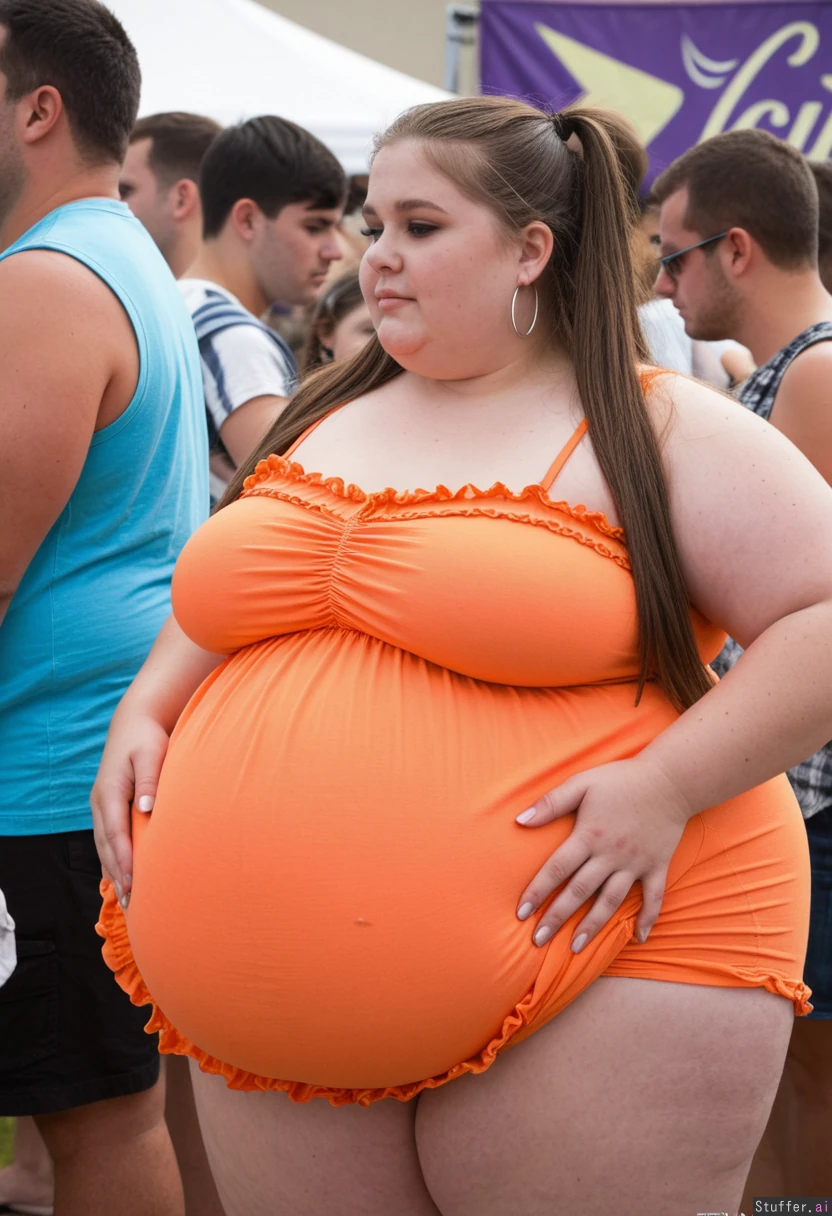 Fully clothed Fashion photo, trendy outfit, obese college student, 21-years-old, wearing ultra bloated and extremely fat-bellied adipose covering sleeveless summerdress with frilled details, ultra fat overhanging ballooned-up hyper_belly beneath clothing, she is standing at an crowded eating contest in a crowded college festival, ultra attractive symmetrical face of a top model, trendy makeup, earrings, critical look with eyeliner, long straight elegant hair, fat arms, largest hyper_belly ever seen beneath her clothing, festival vibes, side view, no nudity, afternoon,