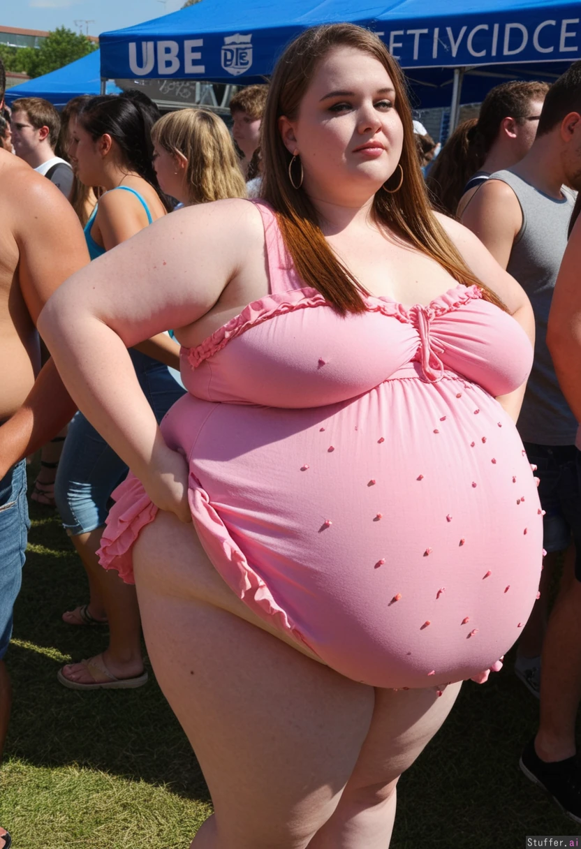 Fully clothed Fashion photo, trendy outfit, obese college student, 21-years-old, wearing ultra bloated and extremely fat-bellied adipose covering sleeveless summerdress with frilled details, ultra fat overhanging ballooned-up hyper_belly beneath clothing, she is standing at an crowded eating contest in a crowded college festival, ultra attractive symmetrical face of a top model, trendy makeup, earrings, critical look with eyeliner, long straight elegant hair, fat arms, largest hyper_belly ever seen beneath her clothing, festival vibes, side view, no nudity, afternoon,