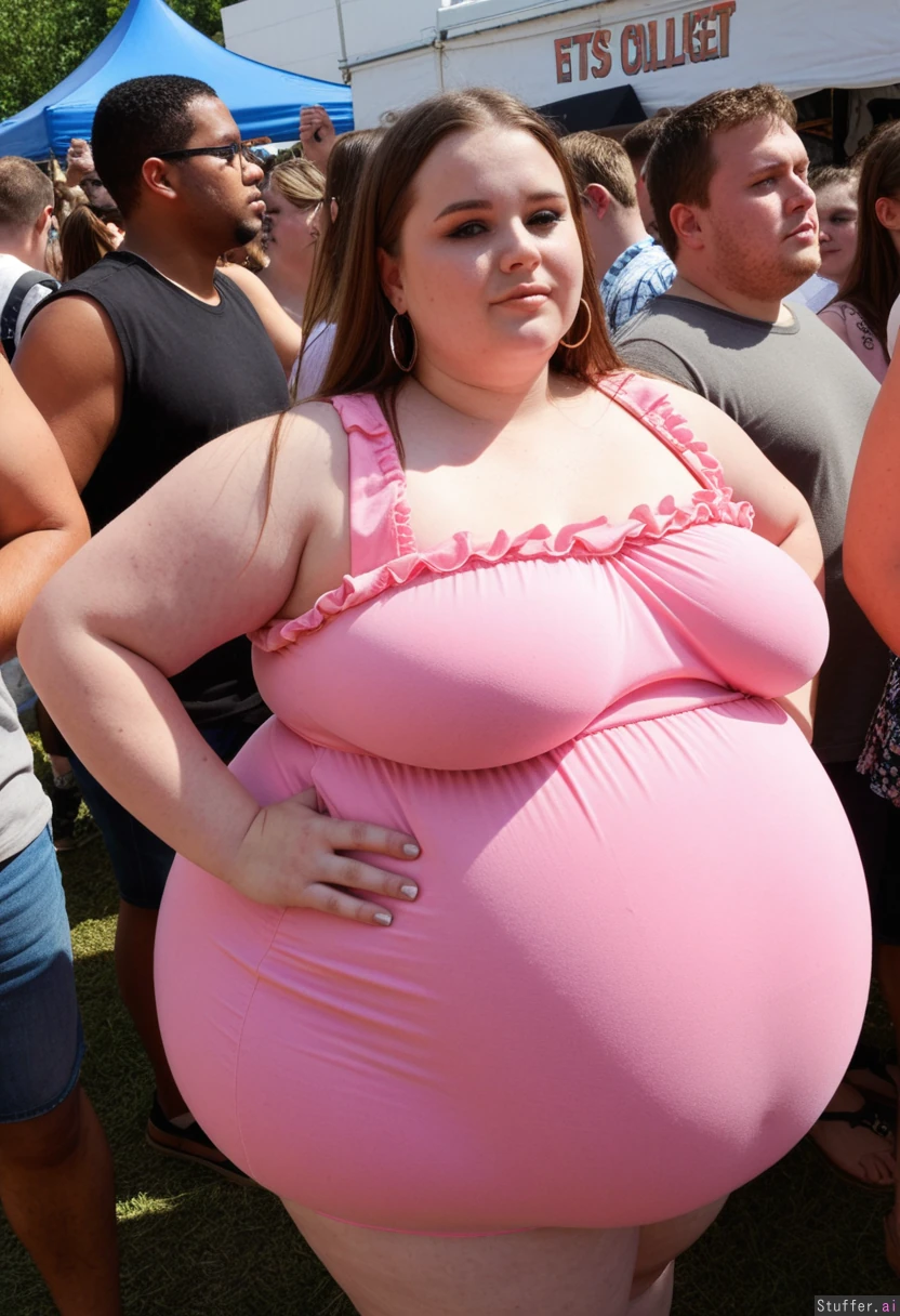 Fully clothed Fashion photo, trendy outfit, obese college student, 21-years-old, wearing ultra bloated and extremely fat-bellied adipose covering sleeveless summerdress with frilled details, ultra fat overhanging ballooned-up hyper_belly beneath clothing, she is standing at an crowded eating contest in a crowded college festival, ultra attractive symmetrical face of a top model, trendy makeup, earrings, critical look with eyeliner, long straight elegant hair, fat arms, largest hyper_belly ever seen beneath her clothing, festival vibes, side view, no nudity, afternoon,