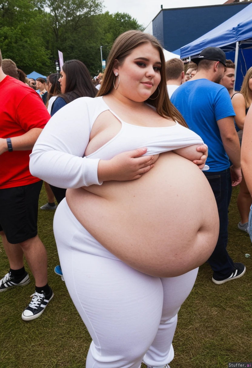 Fully clothed Fashion photo, Instagram lookbook, trendy outfit, obese college student, 21-years-old, wearing a covering ultra bloated and extremely fat-bellied trendy adipose tracksuit, ultra fat overhanging ballooned-up belly beneath clothing, she is standing at an crowded eating contest in a crowded college festival, ultra attractive symmetrical face of a top model, trendy makeup, fancy earrings, foxy look with eyeliner, long elegant hair, fat arms, largest hyper_belly ever seen beneath her clothing, festival vibes, side view, absolutely no nudity, afternoon,