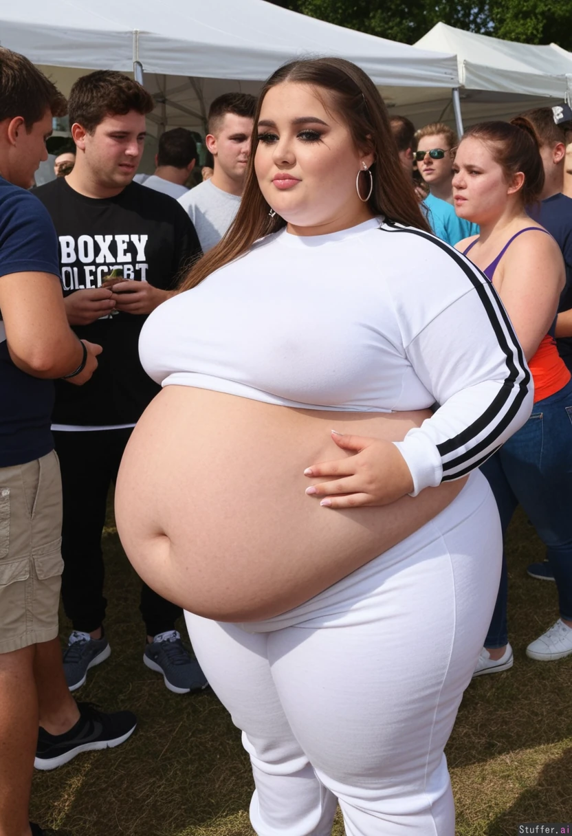 Fully clothed Fashion photo, Instagram lookbook, trendy outfit, obese college student, 21-years-old, wearing a covering ultra bloated and extremely fat-bellied trendy adipose tracksuit, ultra fat overhanging ballooned-up belly beneath clothing, she is standing at an crowded eating contest in a crowded college festival, ultra attractive symmetrical face of a top model, trendy makeup, fancy earrings, foxy look with eyeliner, long elegant hair, fat arms, largest hyper_belly ever seen beneath her clothing, festival vibes, side view, absolutely no nudity, afternoon,