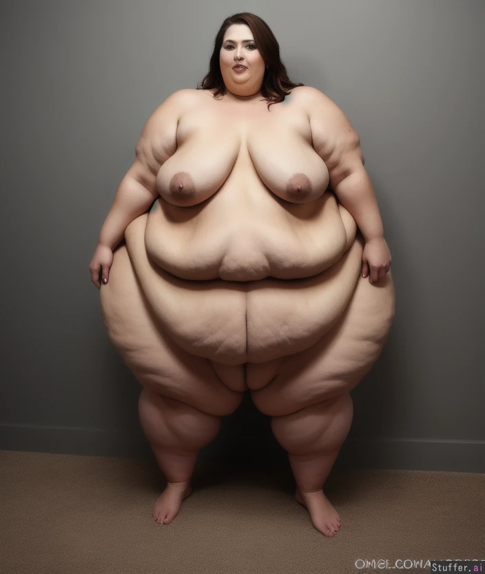 -full body view of a beautiful naked woman standing -beautiful sexy worst obesity problem huge soft and squishy sagging -she loves her wrecked obese shape -sexiest monster obese woman