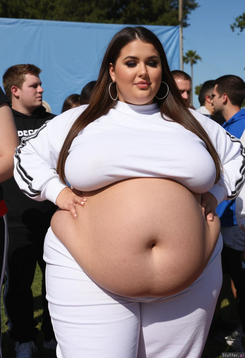 Fully clothed Fashion photo, Instagram lookbook, trendy outfit, obese college student, 21-years-old, wearing a covering ultra bloated and extremely fat-bellied trendy adipose tracksuit, covering ultra fat-bellied bloated tracksuit jacket, covering fat-bellied cushiony bloated tracksuit pants, ultra fat overhanging ballooned-up belly beneath clothing, she is standing at an crowded eating contest in a crowded college festival, ultra attractive symmetrical face of a top model, trendy makeup, fancy earrings, foxy look with eyeliner, long elegant hair, fat arms, largest hyper_belly ever seen beneath her clothing, festival vibes, side view, absolutely no nudity, afternoon,