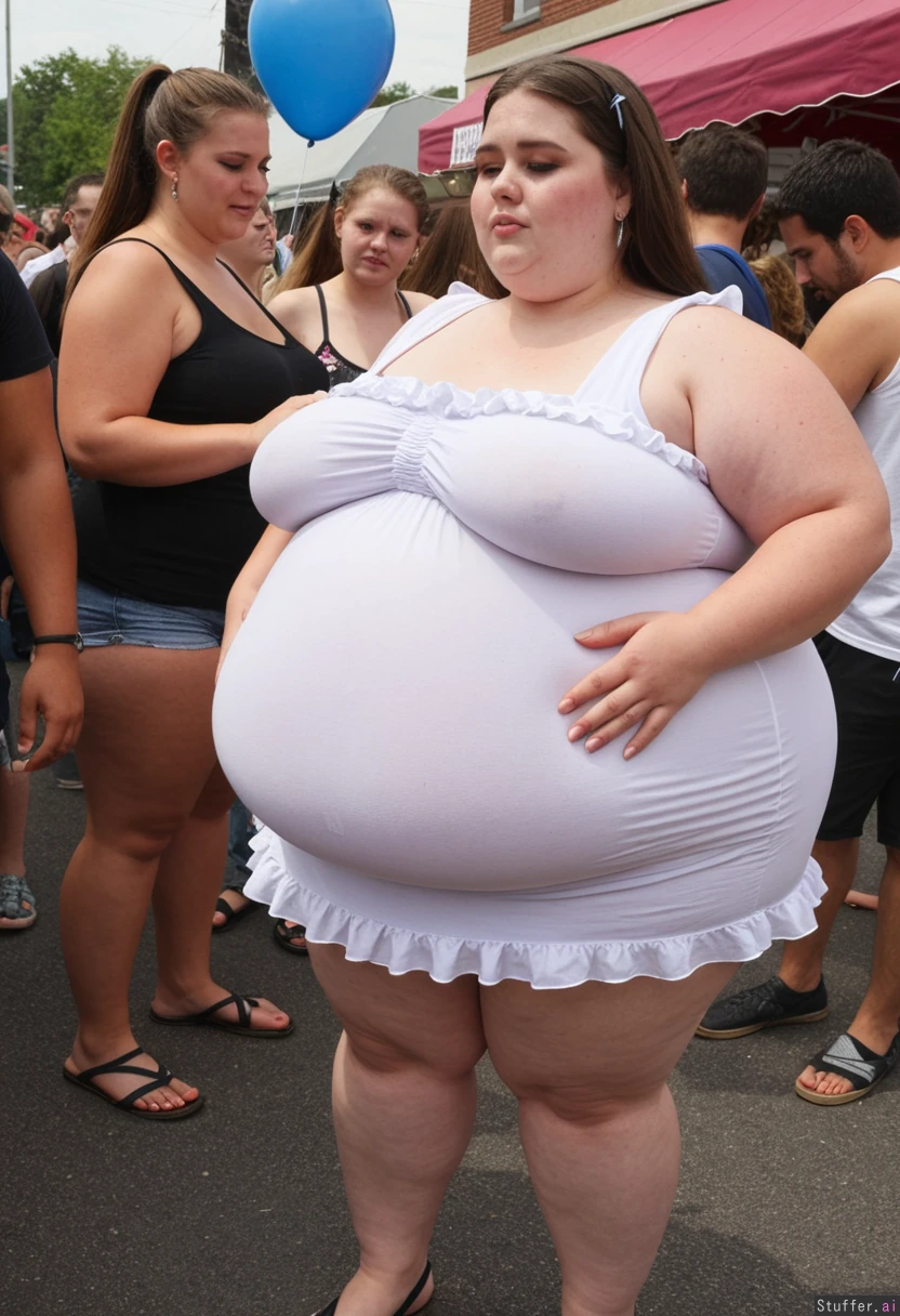 Fully clothed Fashion photo, trendy outfit, obese college student, 21-years-old, wearing ultra bloated and extremely fat-bellied adipose covering sleeveless summerdress with frilled details, ultra fat overhanging ballooned-up hyper_belly beneath clothing, she is standing at an crowded eating contest in a crowded college festival, ultra attractive symmetrical face of a top model, trendy makeup, earrings, critical look with eyeliner, long straight elegant hair, fat arms, largest hyper_belly ever seen beneath her clothing, festival vibes, side view, no nudity, afternoon,