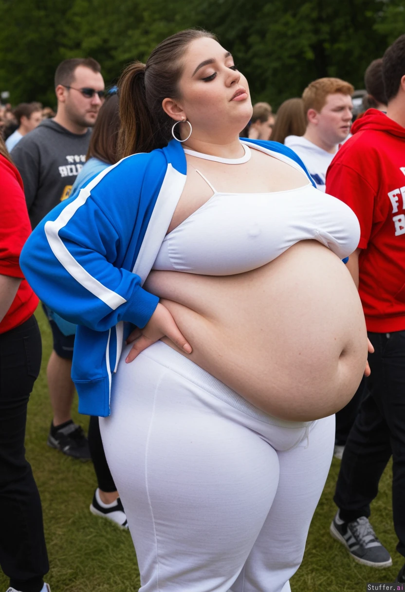 Fully clothed Fashion photo, Instagram lookbook, trendy outfit, obese college student, 21-years-old, wearing a covering ultra bloated and extremely fat-bellied trendy adipose tracksuit, covering ultra fat-bellied bloated tracksuit jacket, covering fat-bellied cushiony bloated tracksuit pants, ultra fat overhanging ballooned-up belly beneath clothing, she is standing at an crowded eating contest in a crowded college festival, ultra attractive symmetrical face of a top model, trendy makeup, fancy earrings, foxy look with eyeliner, long elegant hair, fat arms, largest hyper_belly ever seen beneath her clothing, festival vibes, side view, absolutely no nudity, afternoon,