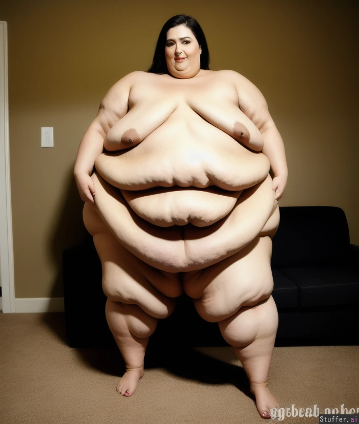 -full body view of a beautiful naked woman standing -beautiful sexy worst obesity problem huge soft and squishy sagging -she loves her wrecked obese shape -sexiest shoulderless monster obese hips and belly woman