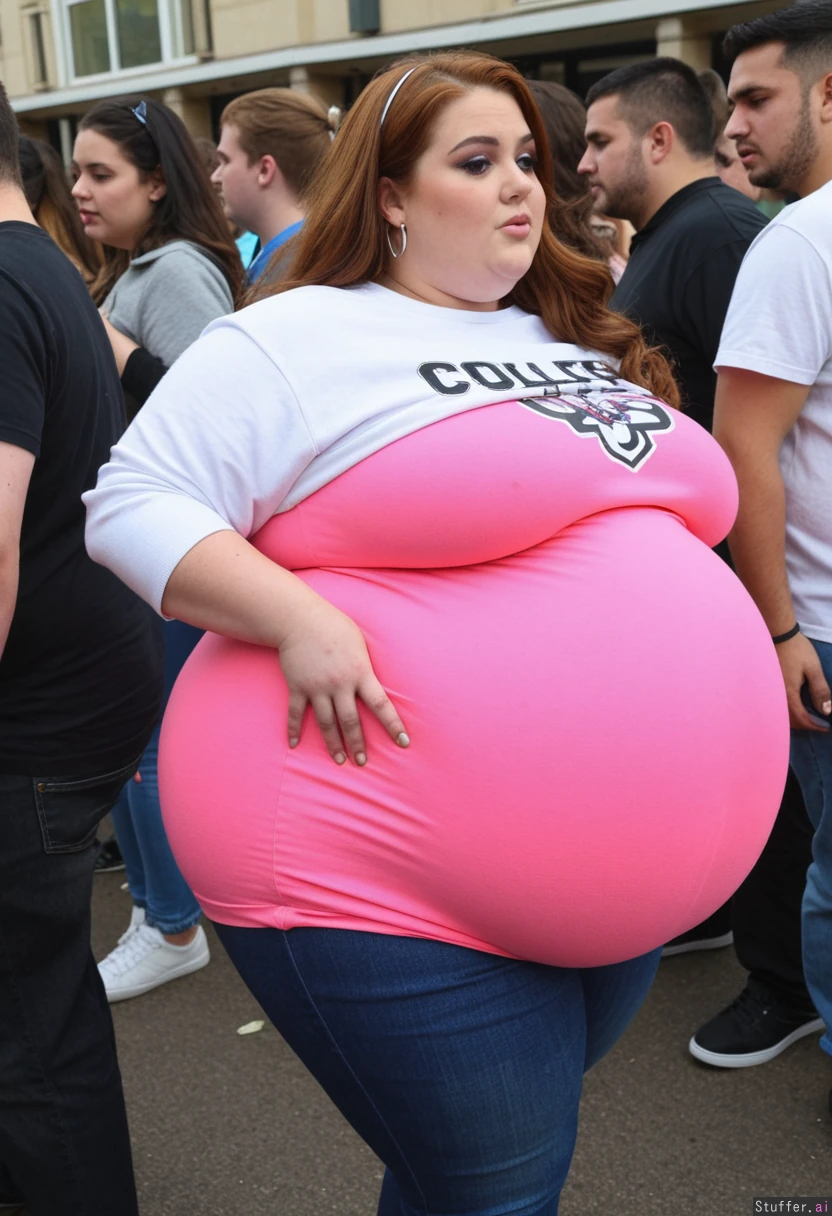 Fully clothed fashion close-up photo, trendy super obese outfit, uktra overweight college student, 21-years-old, wearing a covering ultra bloated and extremely fat-bellied adipose college sweatshirt dress, and fat bloated oversized denim leggings, ultra fat overhanging ballooned-up belly beneath clothing, she is standing at an crowded eating contest in a crowded college festival, ultra attractive symmetrical face of a top model, elegant lonh hair, trendy makeup, earrings, foxy look with eyeliner, fat arms, largest hyper_belly ever seen beneath her clothing, festival vibes, side view, no nudity, afternoon,