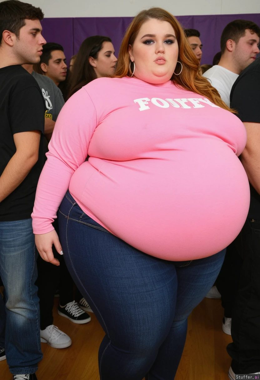 Fully clothed fashion close-up photo, trendy super obese outfit, uktra overweight college student, 21-years-old, wearing a covering ultra bloated and extremely fat-bellied adipose college sweatshirt dress, and fat bloated oversized denim leggings, ultra fat overhanging ballooned-up belly beneath clothing, she is standing at an crowded eating contest in a crowded college festival, ultra attractive symmetrical face of a top model, elegant lonh hair, trendy makeup, earrings, foxy look with eyeliner, fat arms, largest hyper_belly ever seen beneath her clothing, festival vibes, side view, no nudity, afternoon,