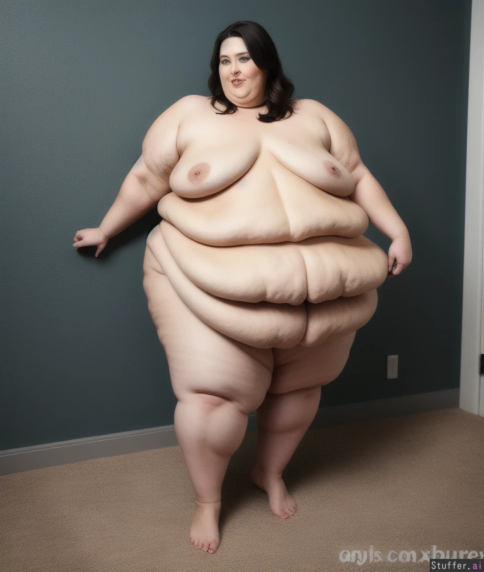 -full body view of a beautiful naked woman standing -beautiful sexy worst obesity problem huge soft and squishy sagging -she loves her wrecked obese shape -sexiest shoulderless monster obese hips and belly woman -waddling obesity