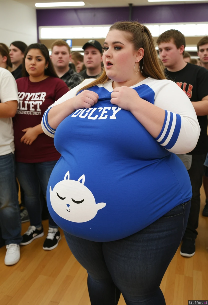 Fully clothed fashion close-up photo, trendy super obese outfit, uktra overweight college student, 21-years-old, wearing a covering ultra bloated and extremely fat-bellied adipose college sweatshirt dress, and fat bloated oversized denim leggings, ultra fat overhanging ballooned-up belly beneath clothing, she is standing at an crowded eating contest in a crowded college festival, ultra attractive symmetrical face of a top model, elegant lonh hair, trendy makeup, earrings, foxy look with eyeliner, fat arms, largest hyper_belly ever seen beneath her clothing, festival vibes, side view, no nudity, afternoon,