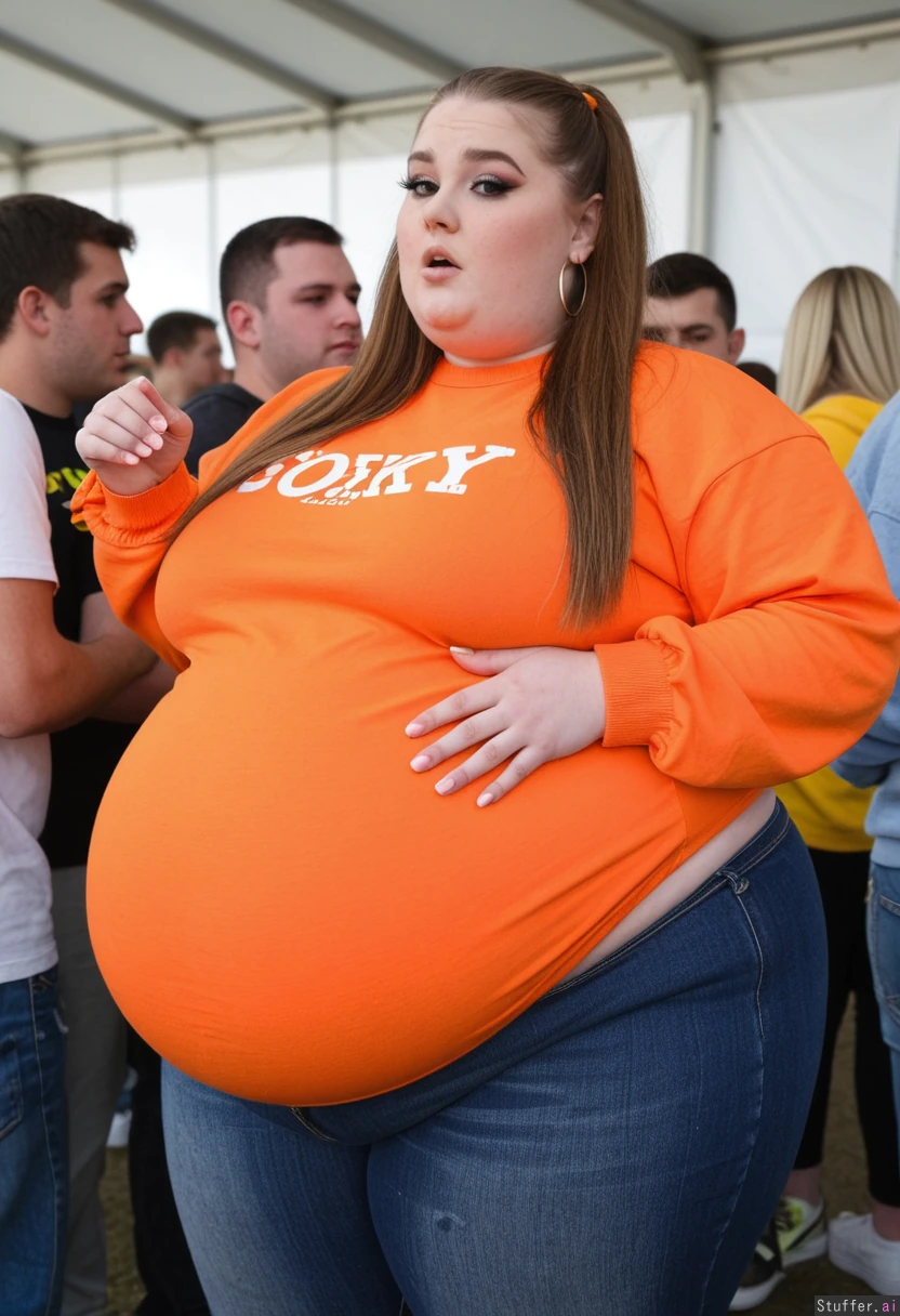 Fully clothed fashion close-up photo, trendy super obese outfit, uktra overweight college student, 21-years-old, wearing a covering ultra bloated and extremely fat-bellied adipose college sweatshirt dress, and fat bloated oversized denim leggings, ultra fat overhanging ballooned-up belly beneath clothing, she is standing at an crowded eating contest in a crowded college festival, ultra attractive symmetrical face of a top model, elegant lonh hair, trendy makeup, earrings, foxy look with eyeliner, fat arms, largest hyper_belly ever seen beneath her clothing, festival vibes, side view, no nudity, afternoon,