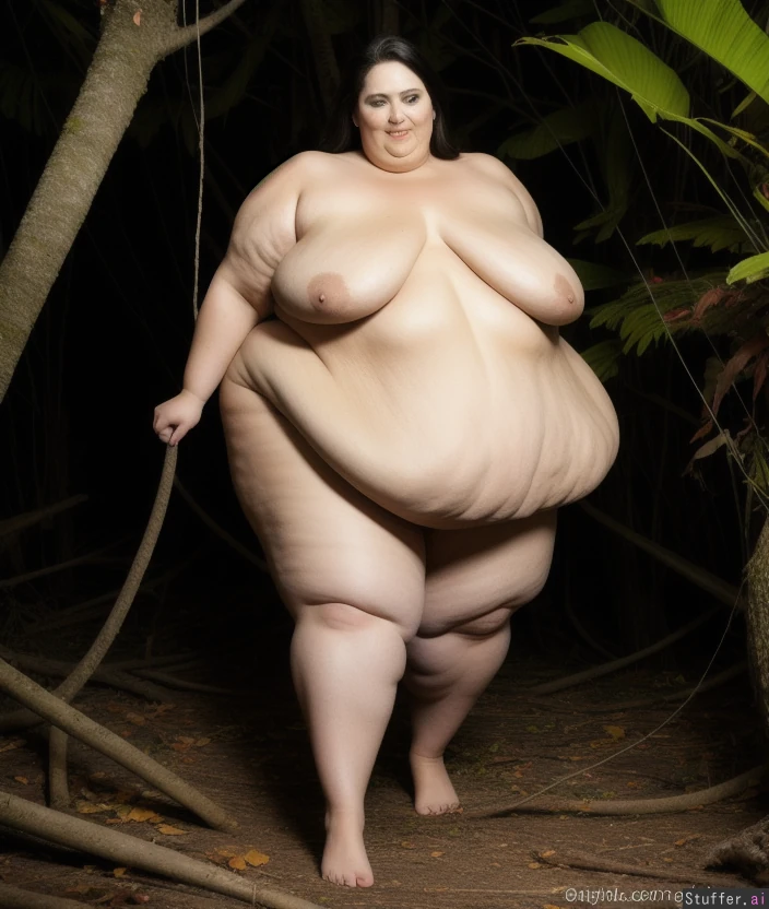 -full body view of a beautiful naked woman standing -beautiful sexy worst obesity problem huge soft and squishy sagging -she loves her wrecked obese shape -jungle obesity unrestrained