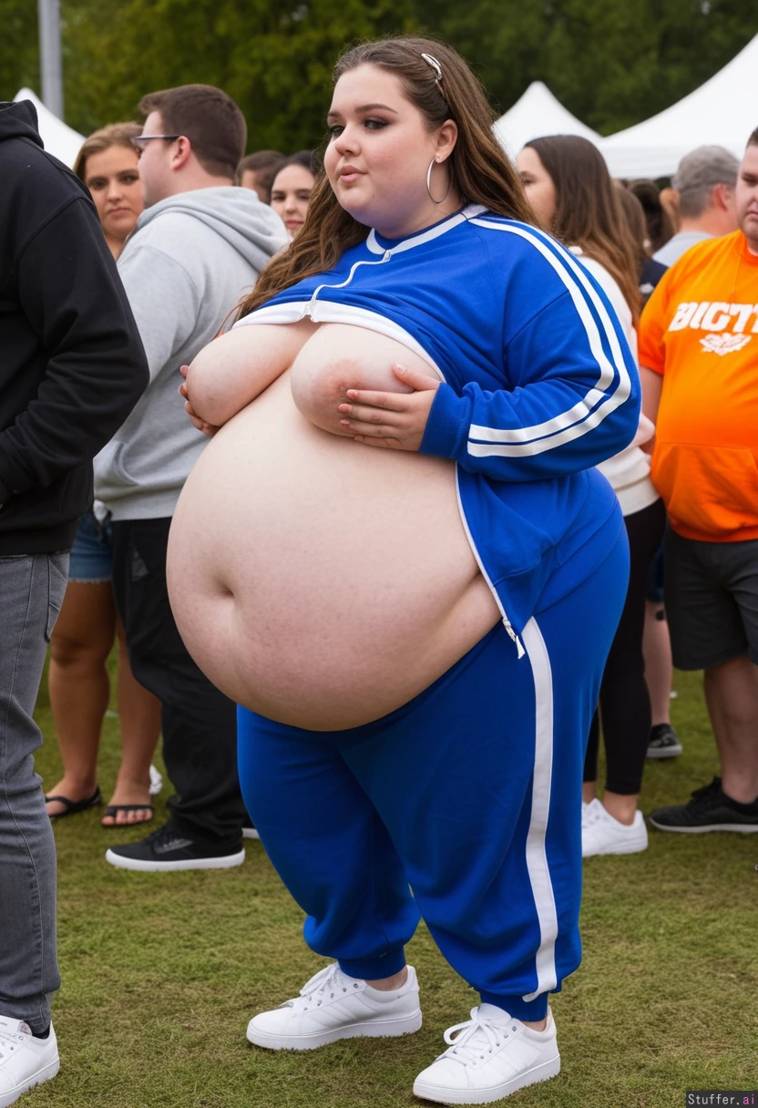Fully clothed Fashion photo, Instagram lookbook, trendy outfit, obese college student, 21-years-old, wearing a covering ultra bloated and extremely fat-bellied trendy adipose tracksuit, covering ultra fat-bellied bloated tracksuit jacket, covering fat-bellied cushiony bloated tracksuit pants, ultra fat overhanging ballooned-up belly beneath clothing, she is standing at an crowded eating contest in a crowded college festival, ultra attractive symmetrical face of a top model, trendy makeup, fancy earrings, foxy look with eyeliner, long elegant hair, fat arms, largest hyper_belly ever seen beneath her clothing, festival vibes, side view, absolutely no nudity, afternoon,