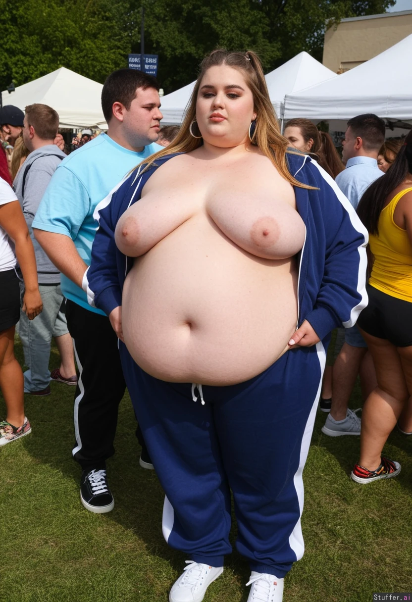 Fully clothed Fashion photo, Instagram lookbook, trendy outfit, obese college student, 21-years-old, wearing a covering ultra bloated and extremely fat-bellied trendy adipose tracksuit, covering ultra fat-bellied bloated tracksuit jacket, covering fat-bellied cushiony bloated tracksuit pants, ultra fat overhanging ballooned-up belly beneath clothing, she is standing at an crowded eating contest in a crowded college festival, ultra attractive symmetrical face of a top model, trendy makeup, fancy earrings, foxy look with eyeliner, long elegant hair, fat arms, largest hyper_belly ever seen beneath her clothing, festival vibes, side view, absolutely no nudity, afternoon,