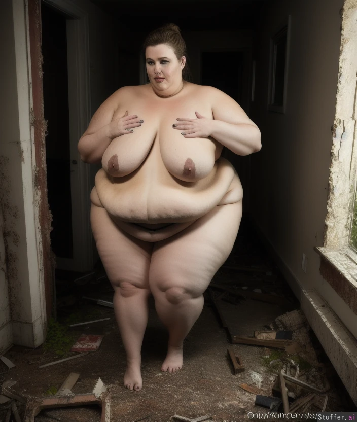 -full body view of a beautiful naked woman standing -beautiful sexy worst obesity problem huge soft and squishy sagging -she loves her wrecked obese shape -largest urbex horror obesity