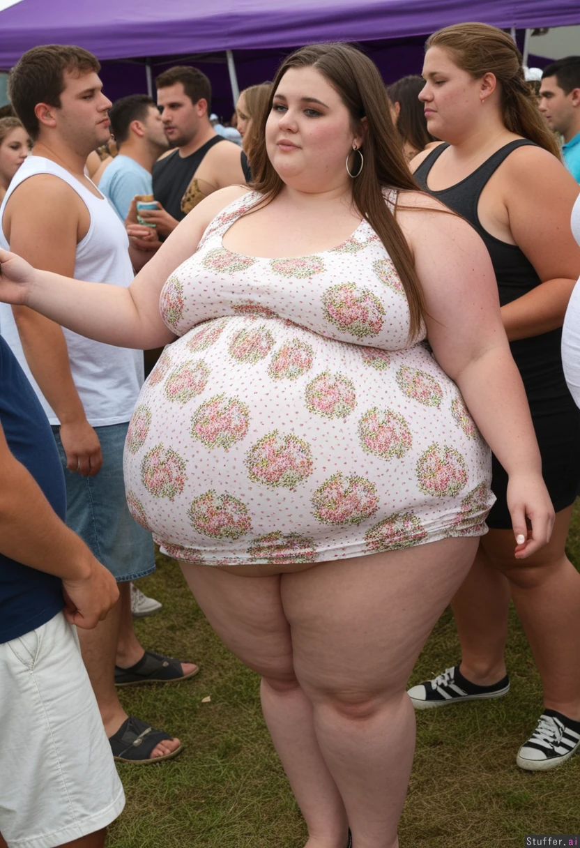Fully clothed Fashion photo, trendy outfit, obese college student, 21-years-old, wearing ultra bloated and extremely fat-bellied adipose covering sleeveless summerdress with floral micro-pattern, ultra fat overhanging ballooned-up hyper_belly beneath clothing, she is standing at an crowded eating contest in a crowded college festival, ultra attractive symmetrical face of a top model, trendy makeup, earrings, critical look with eyeliner, long straight elegant hair, fat arms, largest hyper_belly ever seen beneath her clothing, festival vibes, side view, no nudity, afternoon,