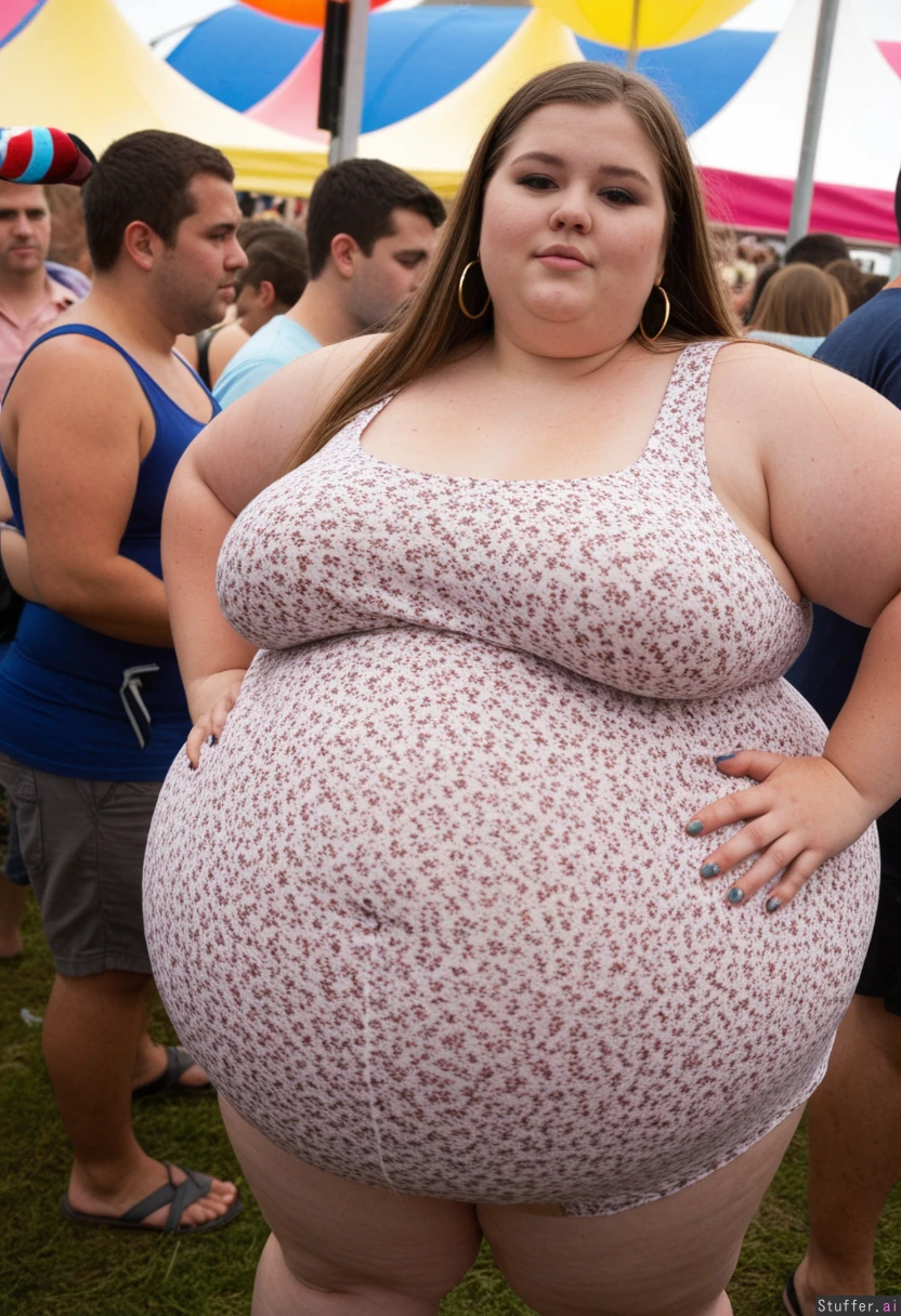 Fully clothed Fashion photo, trendy outfit, obese college student, 21-years-old, wearing ultra bloated and extremely fat-bellied adipose covering sleeveless summerdress with floral micro-pattern, ultra fat overhanging ballooned-up hyper_belly beneath clothing, she is standing at an crowded eating contest in a crowded college festival, ultra attractive symmetrical face of a top model, trendy makeup, earrings, critical look with eyeliner, long straight elegant hair, fat arms, largest hyper_belly ever seen beneath her clothing, festival vibes, side view, no nudity, afternoon,