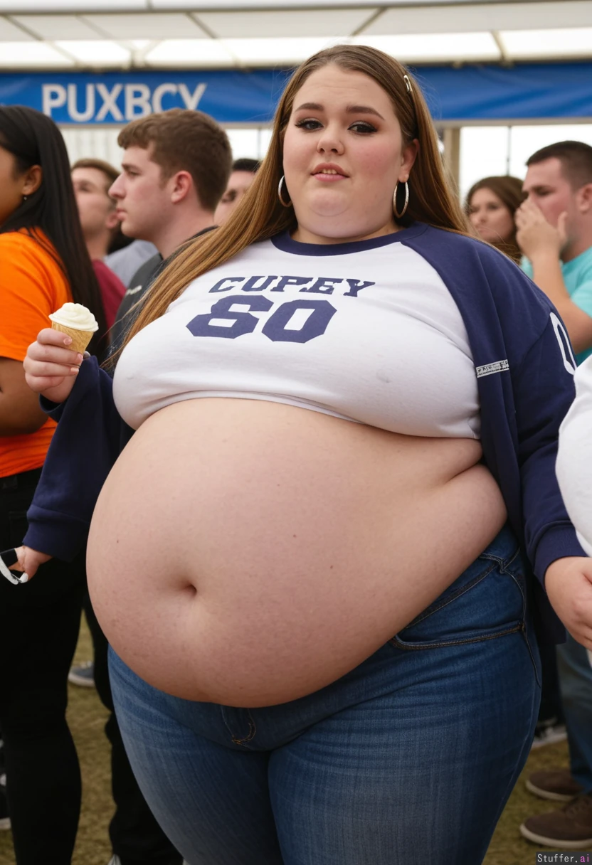 Fully clothed fashion close-up photo, trendy super obese outfit, uktra overweight college student, 21-years-old, wearing a covering ultra bloated and extremely fat-bellied adipose college sweatshirt dress, and fat bloated oversized denim leggings, ultra fat overhanging ballooned-up belly beneath clothing, she is standing at an crowded eating contest in a crowded college festival, ultra attractive symmetrical face of a top model, elegant lonh hair, trendy makeup, earrings, foxy look with eyeliner, fat arms, largest hyper_belly ever seen beneath her clothing, festival vibes, side view, no nudity, afternoon,