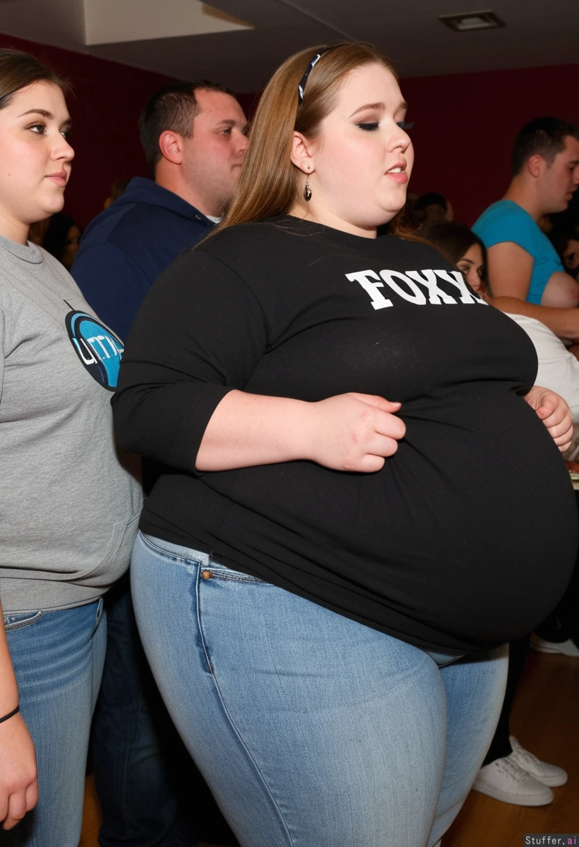 Fully clothed fashion close-up photo, trendy super obese outfit, uktra overweight college student, 21-years-old, wearing a covering ultra bloated and extremely fat-bellied adipose college sweatshirt dress, and fat bloated oversized denim leggings, ultra fat overhanging ballooned-up belly beneath clothing, she is standing at an crowded eating contest in a crowded college festival, ultra attractive symmetrical face of a top model, elegant lonh hair, trendy makeup, earrings, foxy look with eyeliner, fat arms, largest hyper_belly ever seen beneath her clothing, festival vibes, side view, no nudity, afternoon,