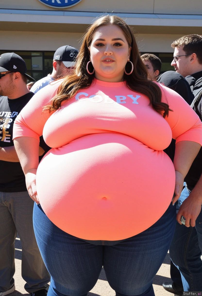 Fully clothed fashion close-up photo, trendy super obese outfit, uktra overweight college student, 21-years-old, wearing a covering ultra bloated and extremely fat-bellied adipose college sweatshirt dress, and fat bloated oversized denim leggings, ultra fat overhanging ballooned-up belly beneath clothing, she is standing at an crowded eating contest in a crowded college festival, ultra attractive symmetrical face of a top model, elegant lonh hair, trendy makeup, earrings, foxy look with eyeliner, fat arms, largest hyper_belly ever seen beneath her clothing, festival vibes, side view, no nudity, afternoon,