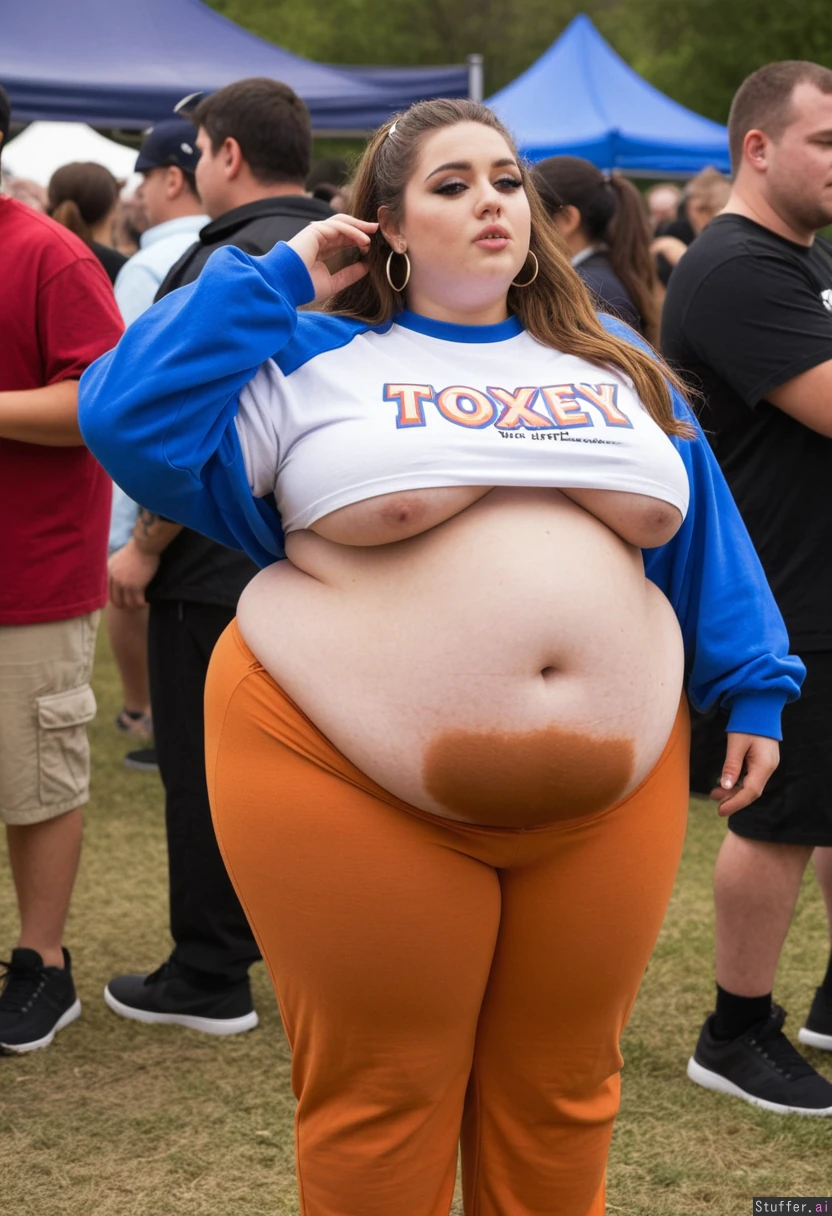 Fully clothed Fashion photo, Instagram lookbook, trendy outfit, obese college student, 21-years-old, wearing a covering ultra bloated and extremely fat-bellied trendy adipose t-shirt, covering ultra fat-bellied bloated tracksuit jacket, covering fat-bellied cushiony bloated tracksuit pants, ultra fat overhanging ballooned-up belly beneath clothing, she is standing at an crowded eating contest in a crowded college festival, ultra attractive symmetrical face of a top model, trendy makeup, fancy earrings, foxy look with eyeliner, long elegant hair, fat arms, largest hyper_belly ever seen beneath her clothing, festival vibes, side view, absolutely no nudity, afternoon,